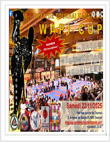Le 1er novembre 2025, la FFKAMA a la joie d'organiser avec la FWE Wado-Kai Cup le championnat européen de karaté à Liège. Ce sera l'occasion de vous mesurer à d'autres délégations internationales. Nous espérons vous y voir très nombreux. Le secretariat